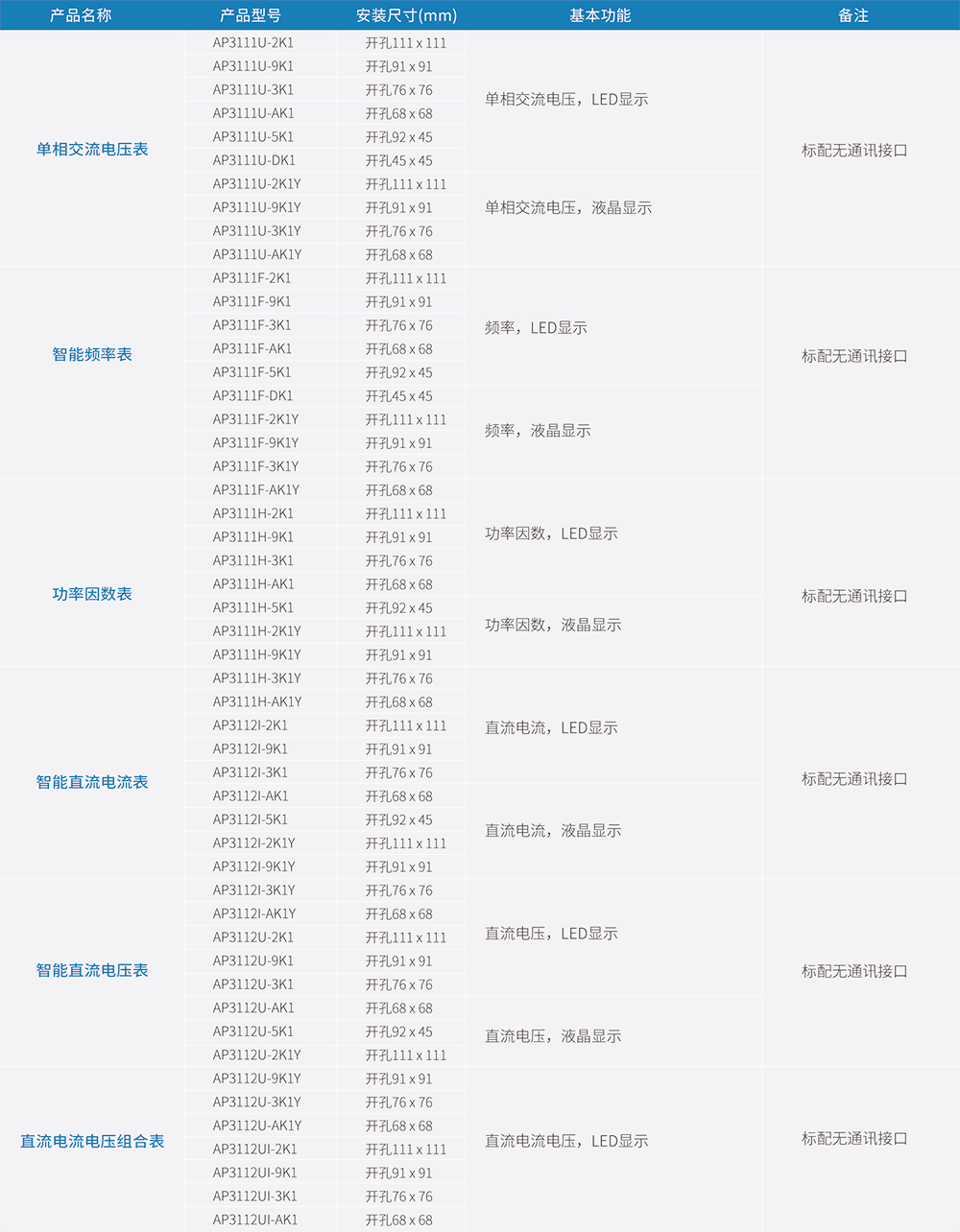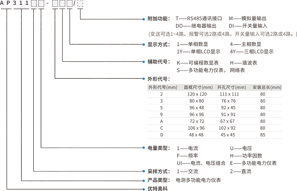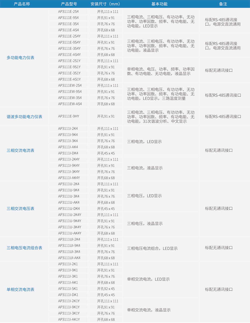 AP311系列多功能电力仪表为新一代可编程、经济型、安装式多功能电力仪表,该系列仪表采用SMT生产工艺、交流采样、真有效值( RMS )测量方式,具有RS-485数字接口,采用MODBUS-RTU通讯规约。该系列仪表种类齐全,可单独或组合实现三相电流、三相电压、单相电流、单相电压、有功功率、无功功率、功率因数、频率、有功电能、无功电能等数据的显示、采集及传输;各类产品均提供LED显示和液晶显示两种选择。广泛用于工业、商业、民用电力系统和变电站中。